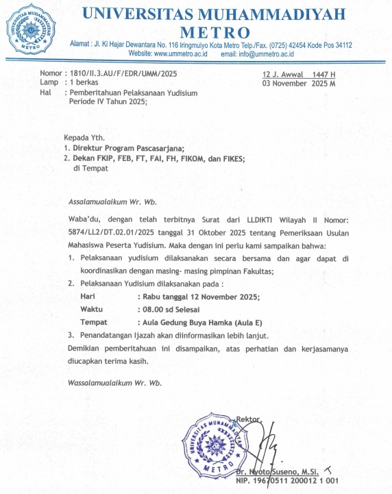 Dengan penuh semangat kebersamaan dan nuansa akademik yang khidmat, Yudisium 4 Tahun 2025 FEB UM Metro diharapkan menjadi perayaan atas prestasi dan perjuangan para mahasiswa sekaligus awal menuju masa depan yang lebih sukses.