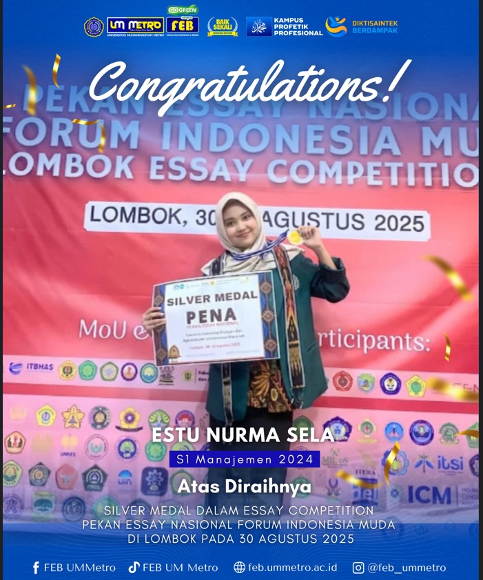 FEB UM Metro – Prestasi membanggakan kembali ditorehkan oleh mahasiswa Fakultas Ekonomi dan Bisnis (FEB) Universitas Muhammadiyah Metro. Kali ini datang dari Estu Nurma Sella, mahasiswa Program Studi S1 Manajemen, yang berhasil meraih Juara 2 (Silver Medal) dalam ajang Pekan Essay Nasional yang digelar di Lombok, Nusa Tenggara Timur.