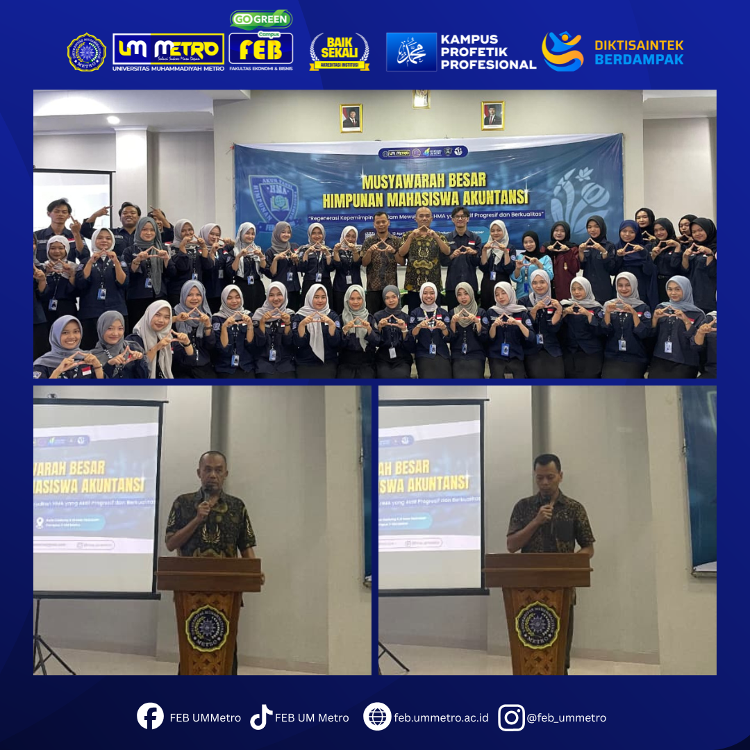 FEB UM Metro, 12 April 2026 – Dekan Fakultas Ekonomi dan Bisnis Universitas Muhammadiyah Metro Dr.E. Febriyanto, SE, MM. secara resmi membuka kegiatan Musyawarah Besar (MUBES) Himpunan Mahasiswa Akuntansi (HMA) pada Ahad, 12 April 2026. Kegiatan ini dilaksanakan di Aula Kampus 3 UM Metro dan berlangsung dengan khidmat serta penuh semangat kebersamaan.
