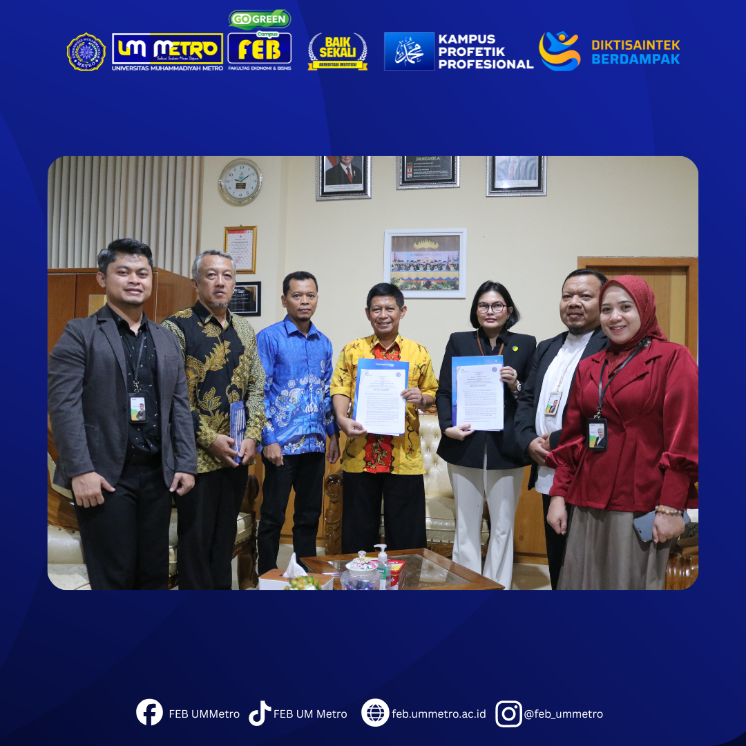 FEB UM Metro, 21 April 2026 – Rektor Universitas Muhammadiyah Metro, Nyoto Suseno, melakukan penandatanganan Nota Kesepahaman (MoU) dengan PT Pegadaian (Persero) Area Lampung. Kegiatan ini berlangsung di ruang rektorat UM Metro pada Selasa (21/04/2026).